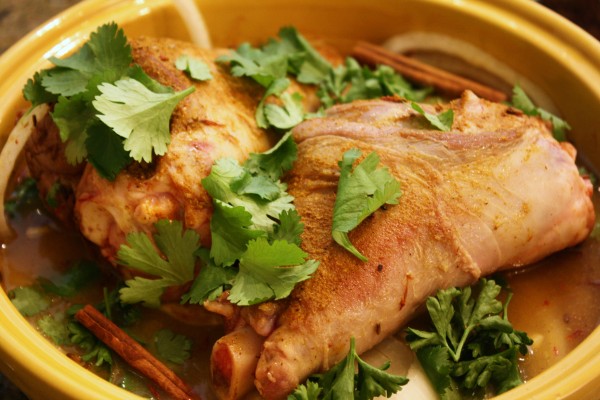 2. Cover the tagine with the top and slide into an oven pre-heated to 325 degrees. Bake for 2 1/2 – 3 hours or until the meat is tender and sliding away from the bone.